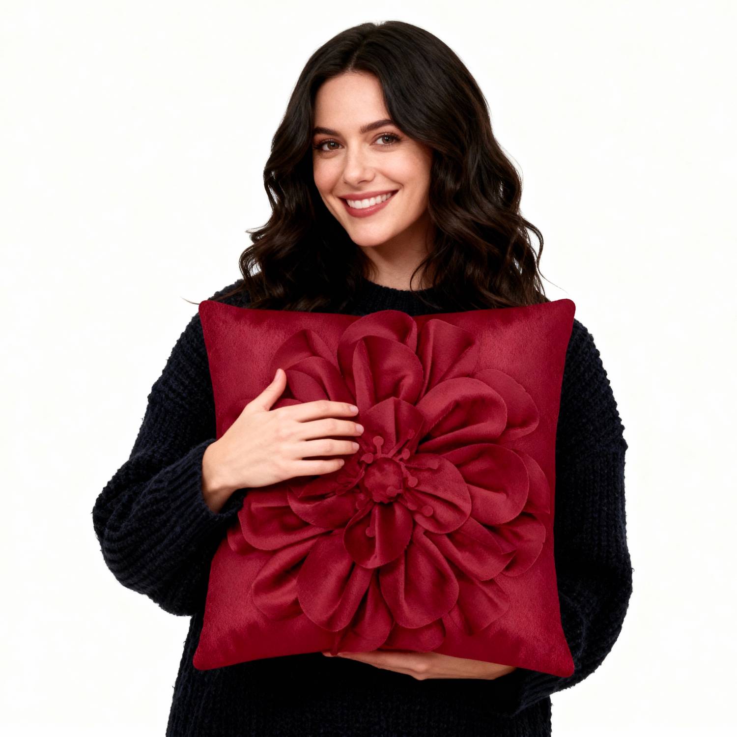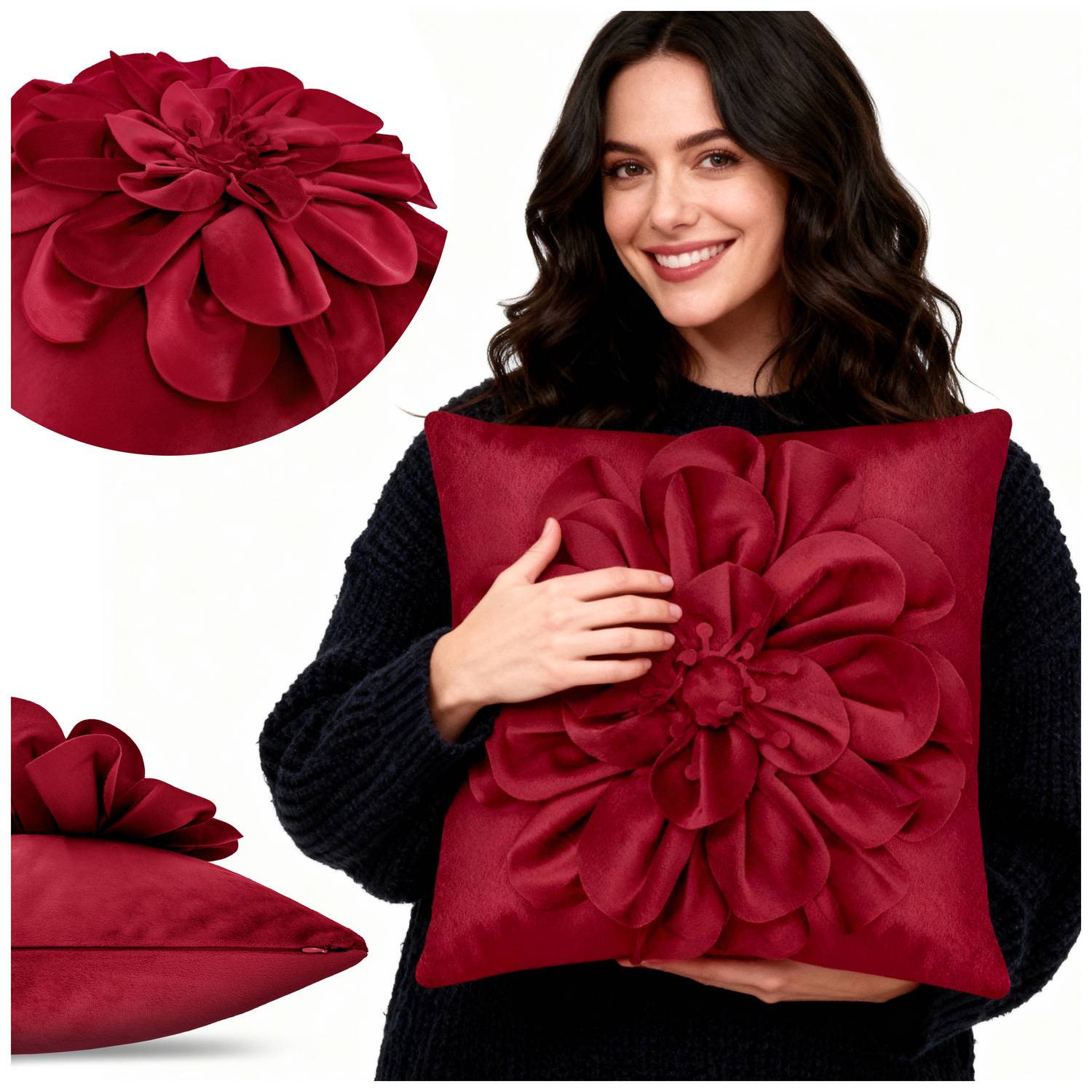 Elegancka poszewka dekoracyjna FOREVER YOURS Kwiat 3D 42x42 cm. Czerwony velvet i trójwymiarowy kwiat – wieczny symbol miłości. Idealny pomysł na prezent od Domarex.