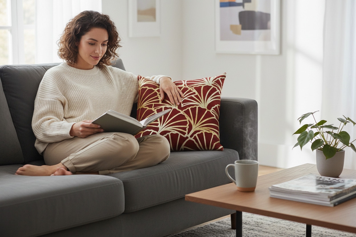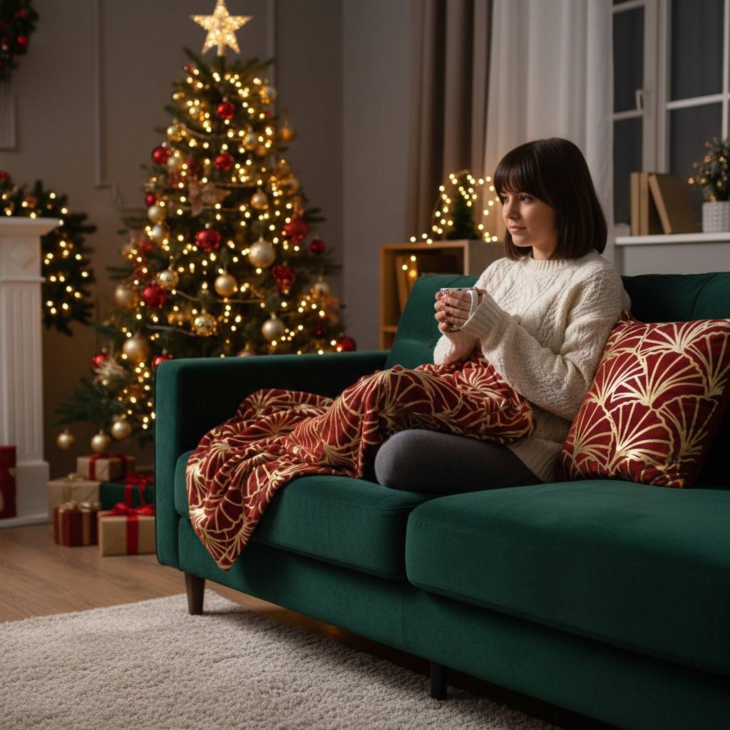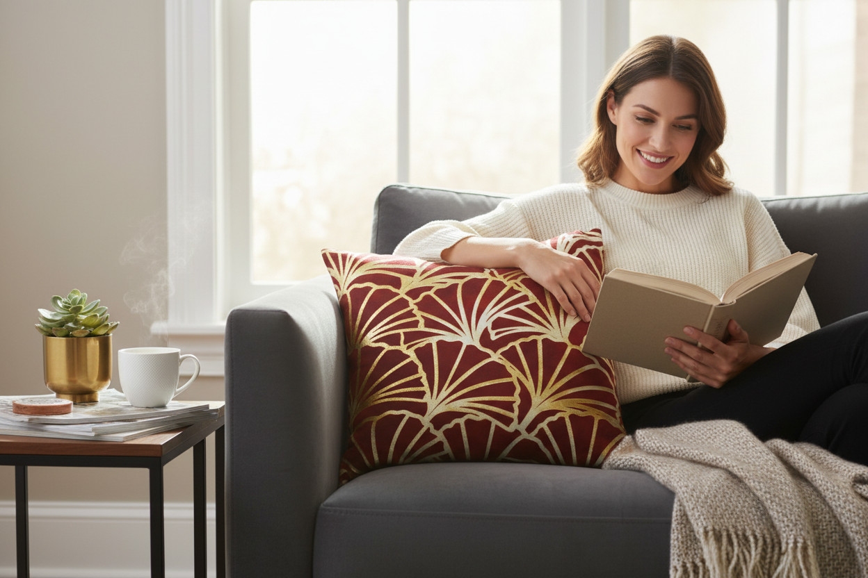 Dodaj swojemu wnętrzu elegancji i luksusowego charakteru dzięki poszewce Velvet GINKGO GOLD w kolorze bordo. To propozycja z ekskluzywnej kolekcji Gold Deco od Domarex, zachwycająca złotym, dekoracyjnym motywem liści ginkgo, który doskonale wpisuje się w styl glamour, modern classic oraz wnętrza premium.