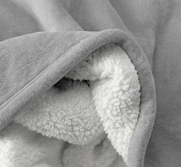 Dwustronna: Sherpa/baranek (odcień zbliżony do bieli) × mikroflanela velvet (szary).
